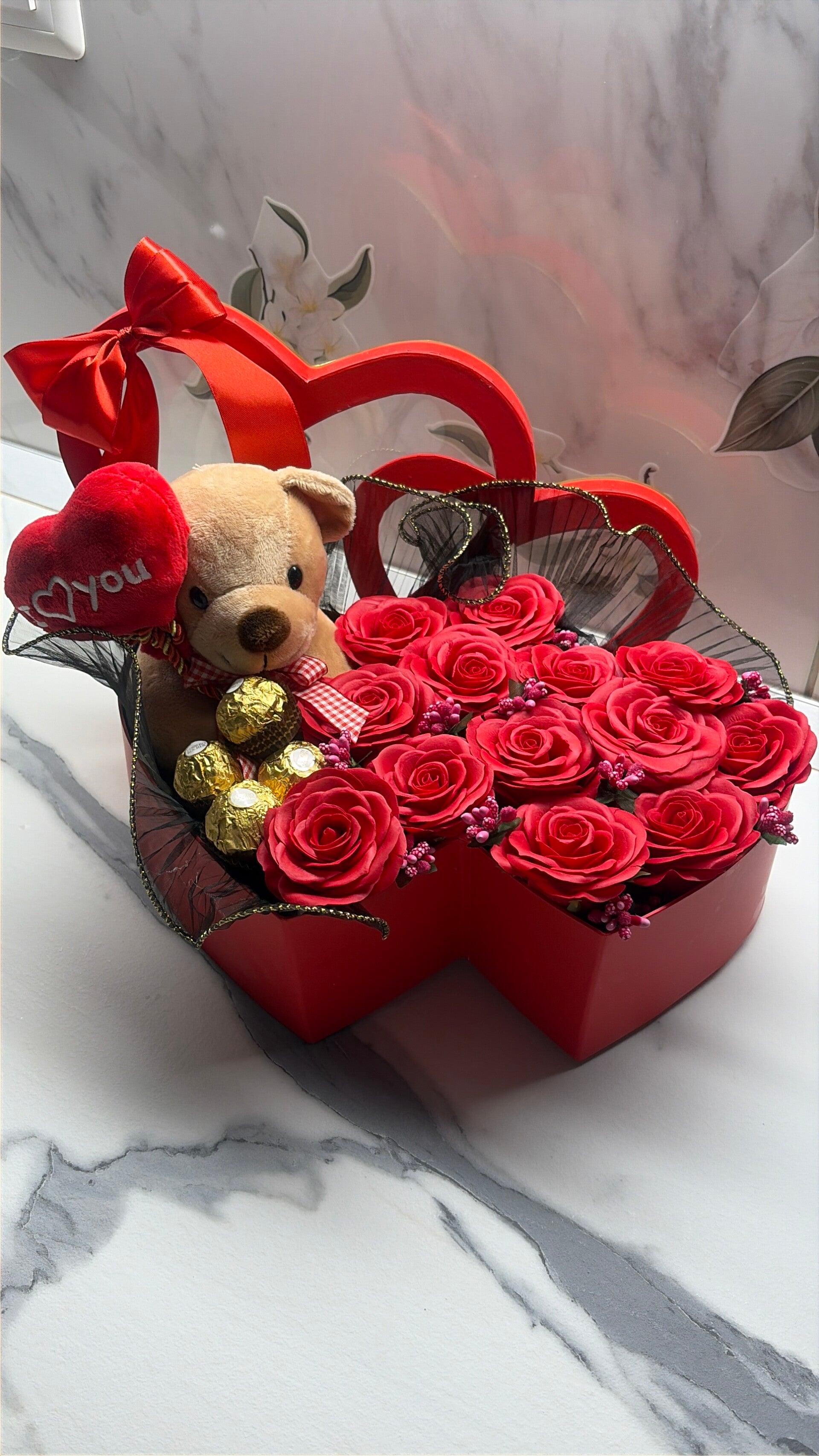 Cuore con rose di sapone e orsetto