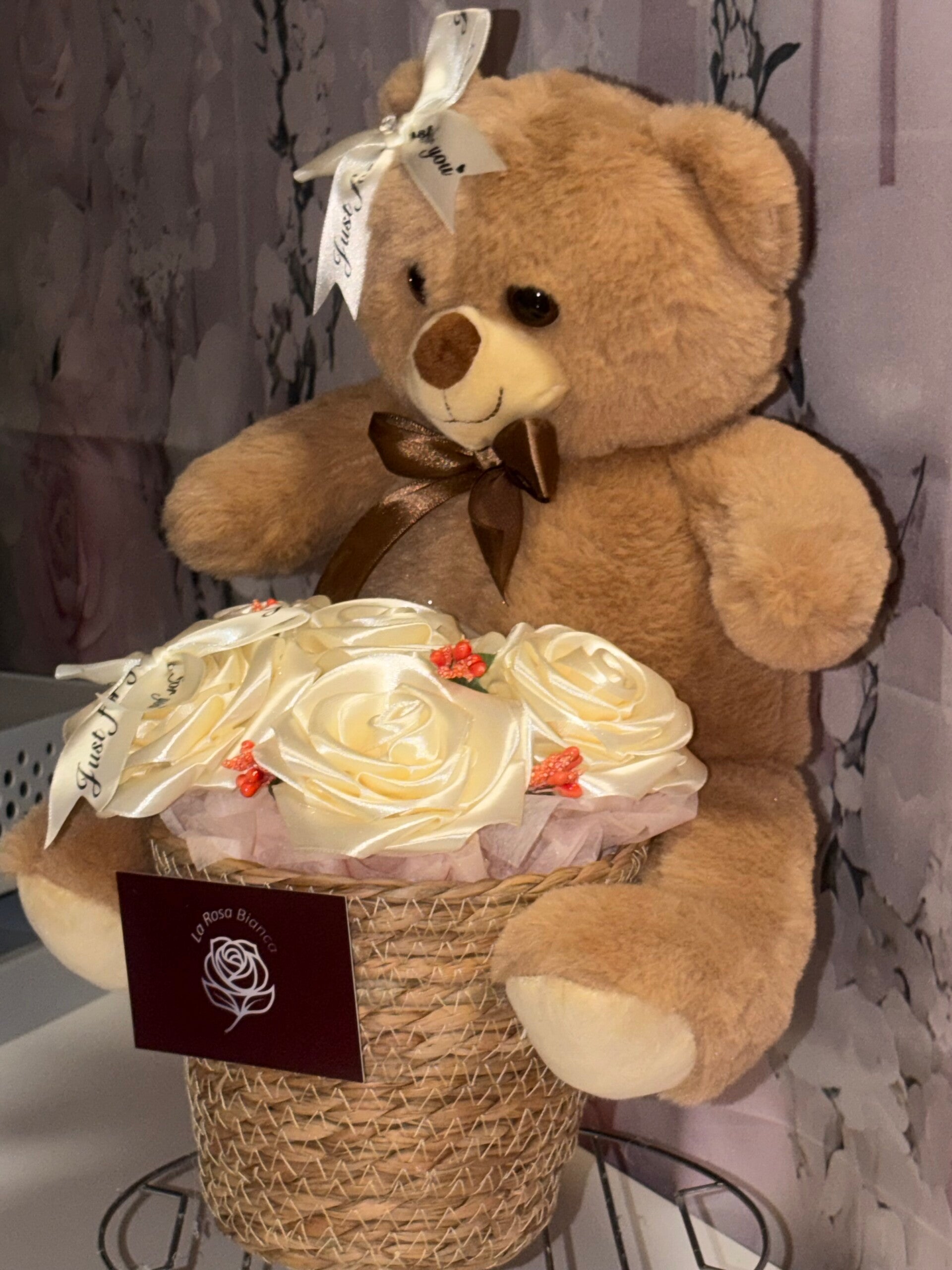Cestino con rose di seta e orsetto